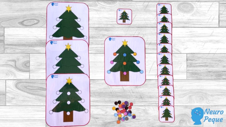 La idea es que los peques, completen las bolas del árbol de navidad o bien con los círculos de colores o bien con pompones de colores. Podéis poner las tarjetas modelo y que los niños añadan en el árbol grande las bolas según el modelo o bien en un árbol grande poner vosotros los pompones o los círculos de colores y que el peque lo copie en el otro árbol.