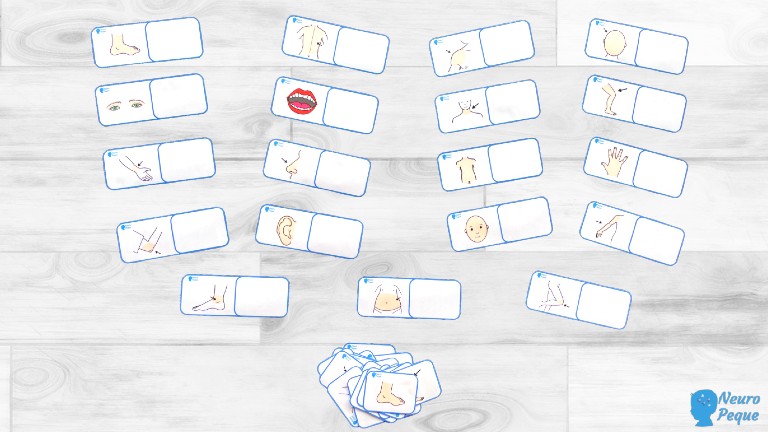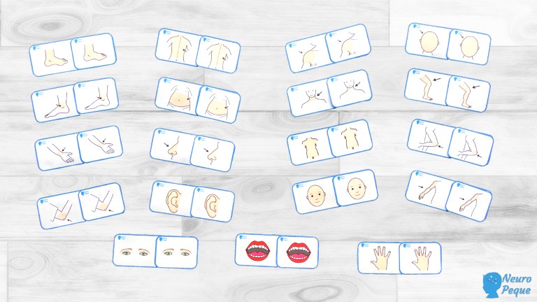 El material, que podréis descargar al final del post, incluye 19 tarjetas alargadas con diferentes partes del cuerpo y un recuadro vacío. Además, de 19 tarjetas más pequeñas con las imágenes del las partes del cuerpo correspondientes.