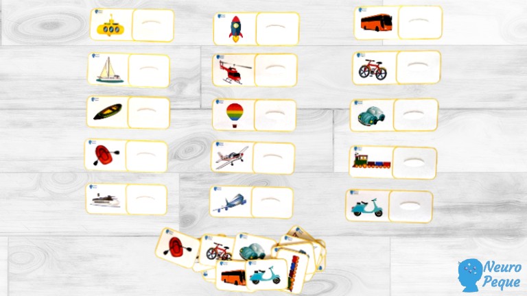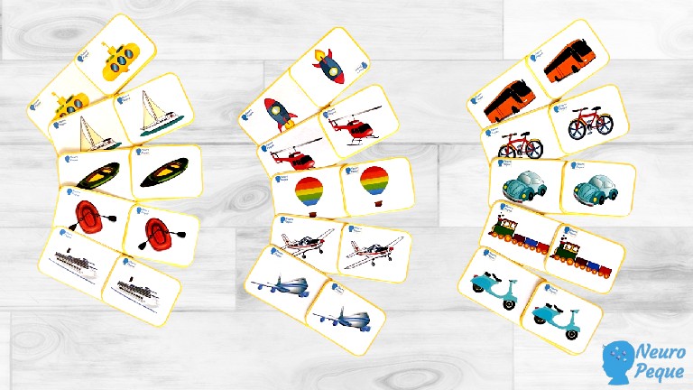 Colocamos las tarjetas alargadas que contienen los medios de transporte en la mesa y dejamos las tarjetas pequeñas con los iguales por la mesa. Los peques tendrán que buscar y colocar cada tarjeta en su lugar correspondiente.