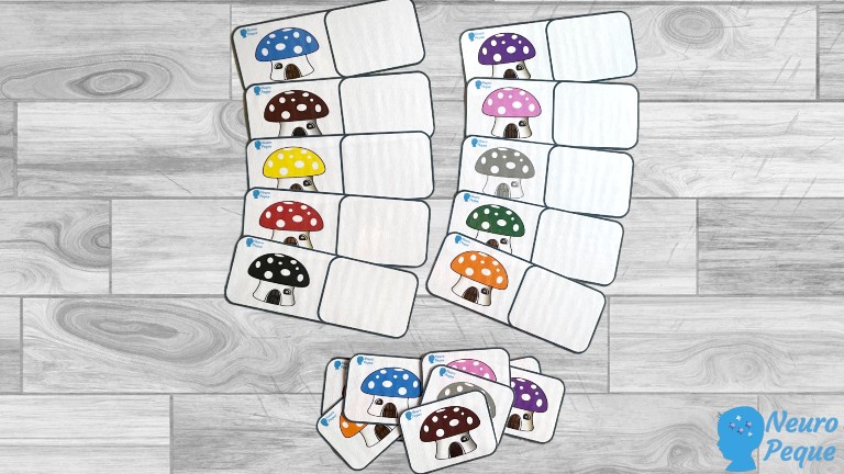 Colocamos las tarjetas alargadas que contienen las setas en la mesa y dejamos las tarjetas pequeñas con los iguales repartidas por la mesa.  Los peques tendrán que buscar y colocar cada tarjeta en su lugar correspondiente.