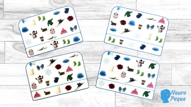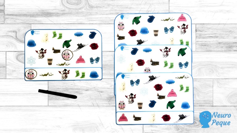 La idea es que los peques, encuentren los dibujos de invierno en los recuadros. Cuando los hayan localizado, pueden rodearlos con un rotulador de pizarra blanca o bien poner encima de cada dibujo una ficha de madera.