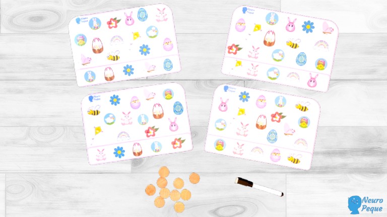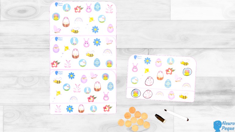 La idea es que los peques, encuentren los dibujos de primavera en los recuadros. Cuando los hayan localizado, pueden rodearlos con un rotulador de pizarra blanca o bien poner encima de cada dibujo una ficha de madera.