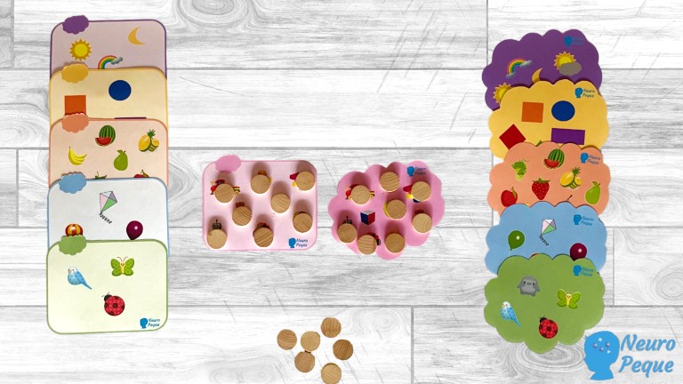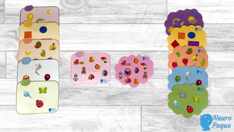 La idea es que los peques, encuentren los dibujos repetidos o no repetidos de las tarjetas cuadradas en las tarjetas en forma de nube correspondientes (en función del color). Cuando los hayan localizado, pueden rodearlos con un rotulador de pizarra blanca o bien poner encima de cada dibujo una ficha de madera. A la vez podemos trabajar el vocabulario por categorías.