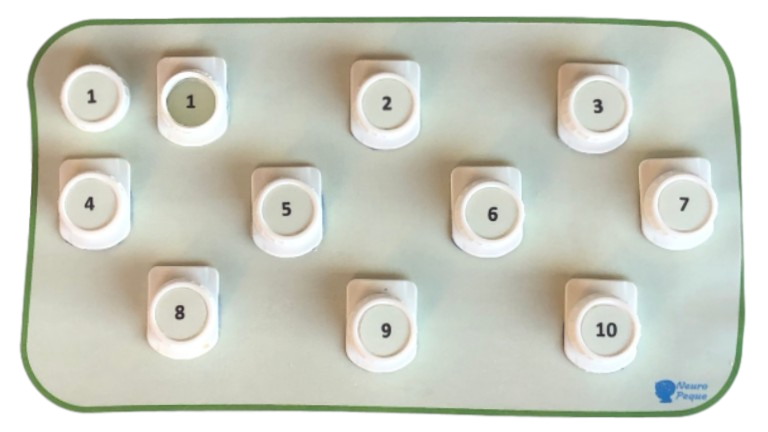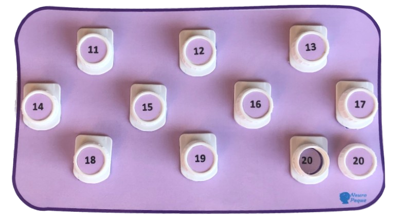 La idea es que los niños tengan que buscar el número del tapón, y enroscarlo en la rosca que tiene el mismo número. De esta manera se pueden aprender los números pero además, podremos trabajar la atención y fomentar la motricidad fina y la coordinación visomotora.