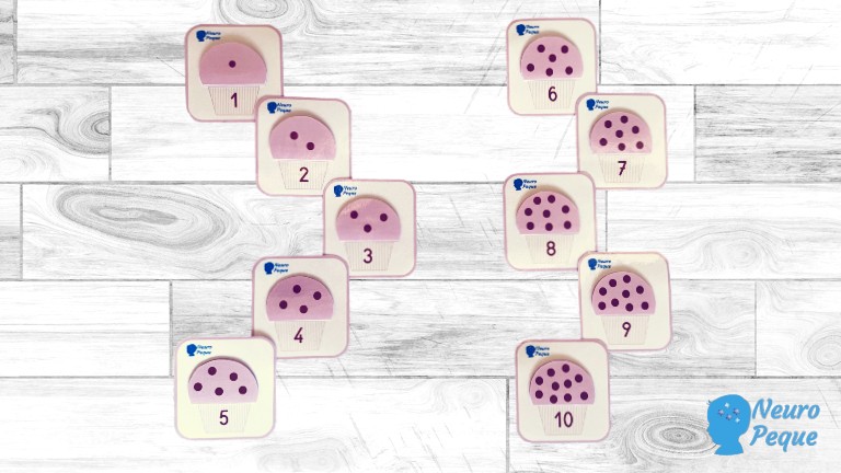 El material, que podréis descargar en el enlace que os muestro más abajo, contiene 10 cuadros con el dibujo de un muffin. En la parte de abajo del muffin aparece el número en cifra. Después encontraréis 10 partes de arriba de los muffin con los puntos.