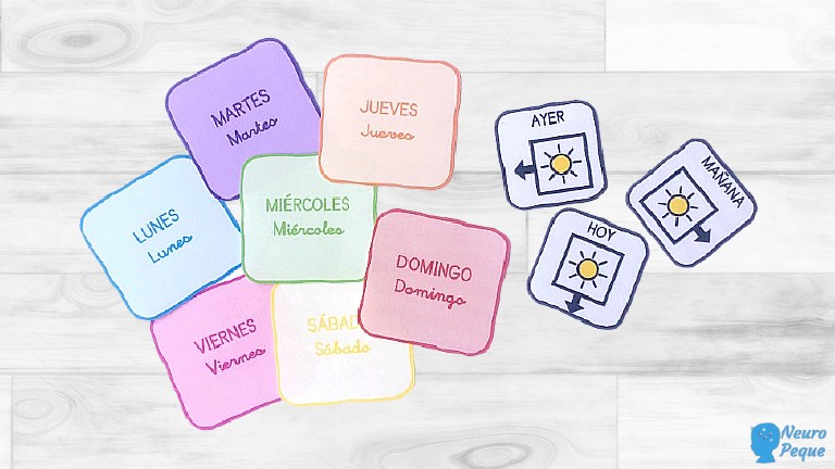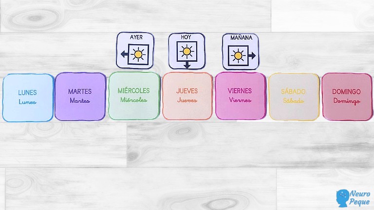 El material esta compuesto por 7 tarjetas de diferentes colores, en el que está escrito un día de la semana en cada una de ellas, tanto en mayúscula como en minúscula y 3 tarjetas con los conceptos temporales de «ayer, hoy y mañana», para situarlo encima de los días correspondientes.