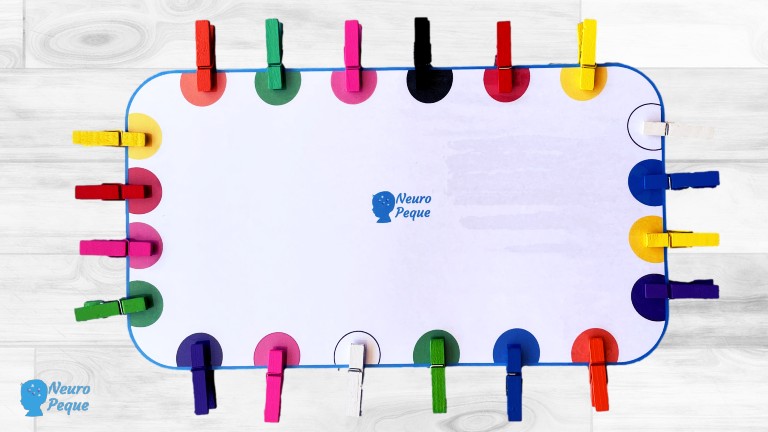 La idea es que los niños tengan que buscar la pinza de cada color y pinzar el semicírculo del color correspondiente. Además, también podrán contar cuantas pinzas de cada color necesitamos. De esta manera, se pueden aprender los colores, pero además, podremos trabajar la atención, la motricidad fina y también el conteo.