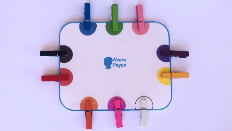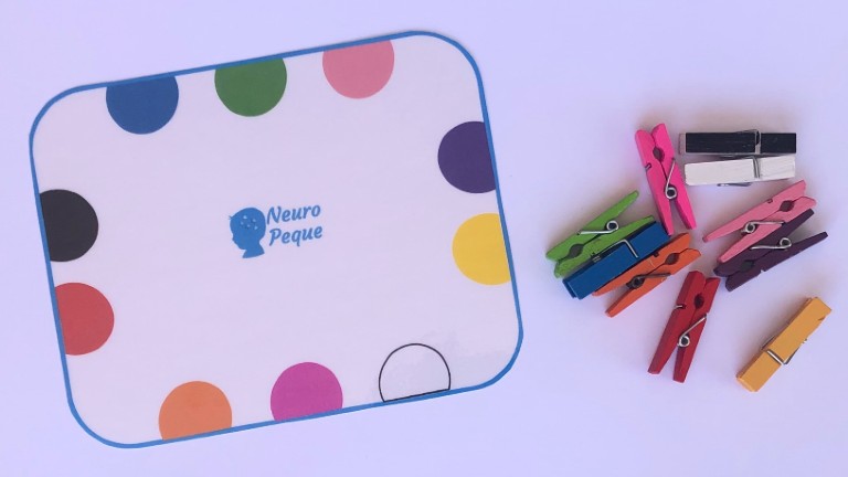 La idea es que los niños tengan que buscar la pinza de cada color y pinzar el semicírculo del color correspondiente. De esta manera, se pueden aprender los colores pero además, podremos trabajar la atención y motricidad fina.