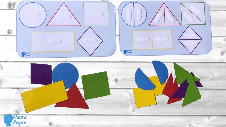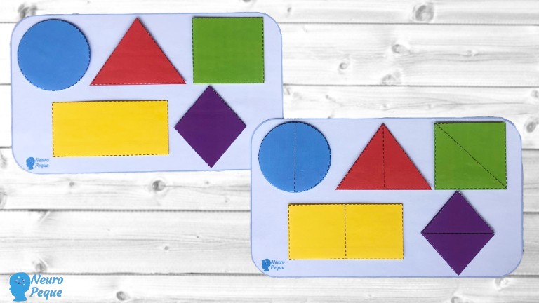 La idea es que los peques coloquen las formas en las plantillas. En una de ellas, podrán colocar las figuras completas y en la otra, están divididas en dos piezas para que tengan que colocar cada parte junto a la otra, a modo de puzzle, para formar las formas.