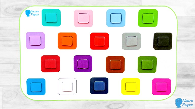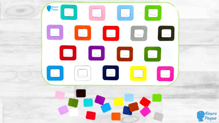 La idea es que los peques, busquen los colores correspondientes al recuadro y lo sitúen en su sitio. Mientras trabajamos atención a través de la búsqueda, trabajaremos también el nombre y el reconocimiento de colores.