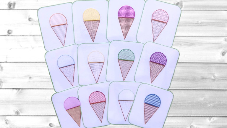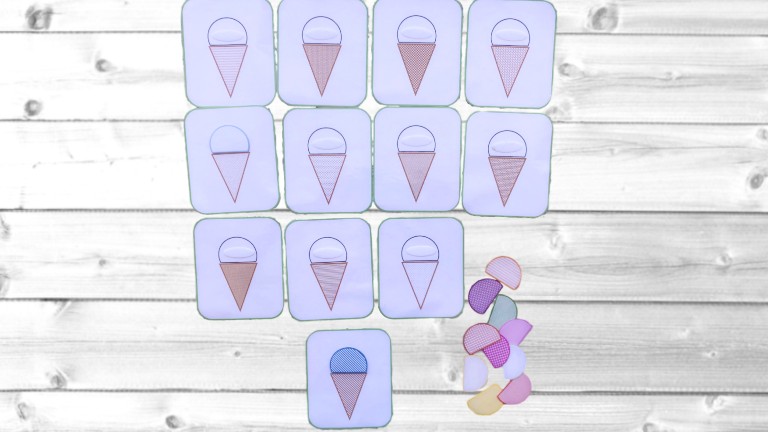 El material, que podéis descargar al final del post, contiene 12 tarjetas con conos de helado de diferente trama. Además de 12 bolas de helado de diferentes colores y tramas.