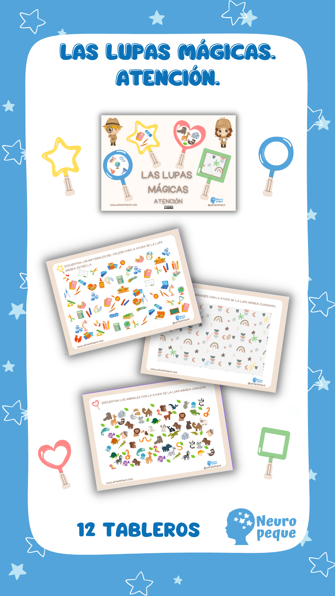 ¿Quieres estimular la atención de tus alumn@s de forma divertida? Las Lupas Mágicas l@s convierten en pequeñ@s detectives, trabajando la concentración y la discriminación visual mientras juegan. Incluye 12 tableros ilustrados, 4 lupas con formas originales y tarjetas de búsqueda que transforman cada reto en una experiencia motivadora y entretenida.