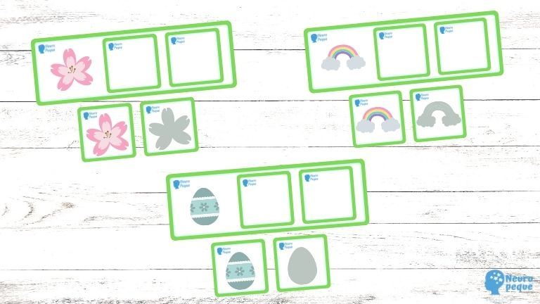 Para trabajar con «Sombras y dibujos de primavera», la idea es repartir las tarjetas alargadas y las tarjetas pequeñas por la mesa para que los peques vayan buscando y colocando los dibujos y las sombras en la tarjeta correspondiente.