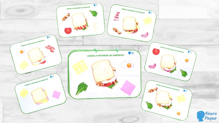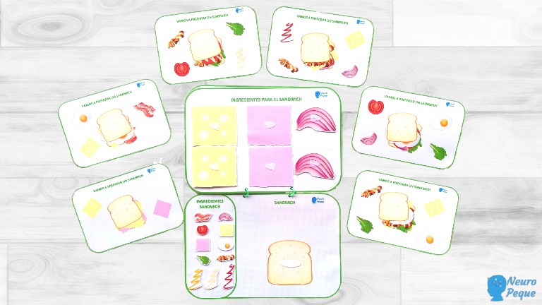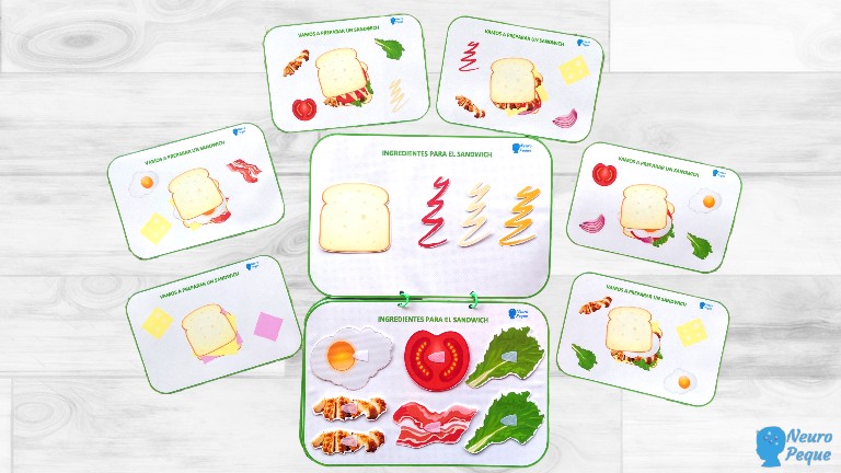 La idea es que los peques preparen sandwich con diferentes ingredientes según los que marquemos nosotros en la lámina o bien que los modelos ya hechos.
