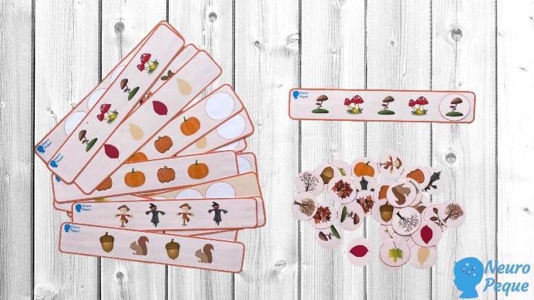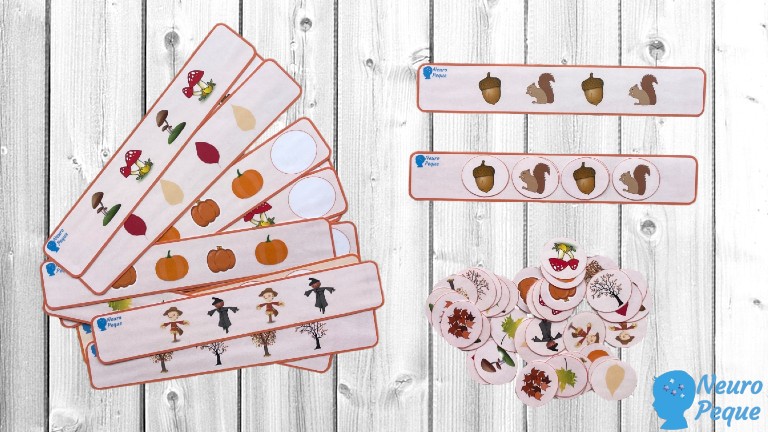 Para que el material os dure más tiempo, os recomiendo que lo recortéis y plastifiquéis todo. También os aconsejo que le pongáis velcro a los círculos de la tarjeta alargada y a las tarjetas circulares de imágenes de otoño para que los peques puedan poner y quitar los círculos de las tarjetas.