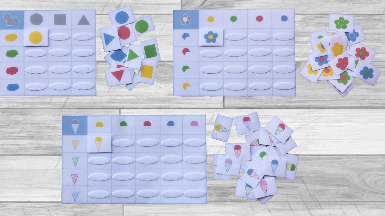 El material, que podréis descargar al final del post, incluye 3 tablas de dificultad creciente con cuadrículas de 3×3, 3×4, 3×5. Además de las imágenes correspondientes para recortar.