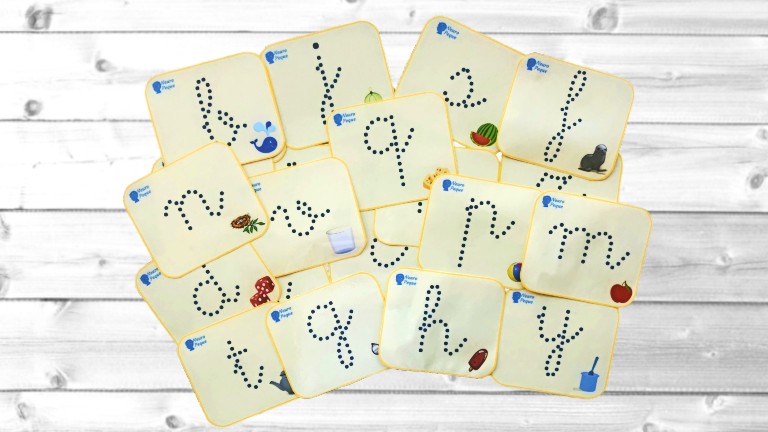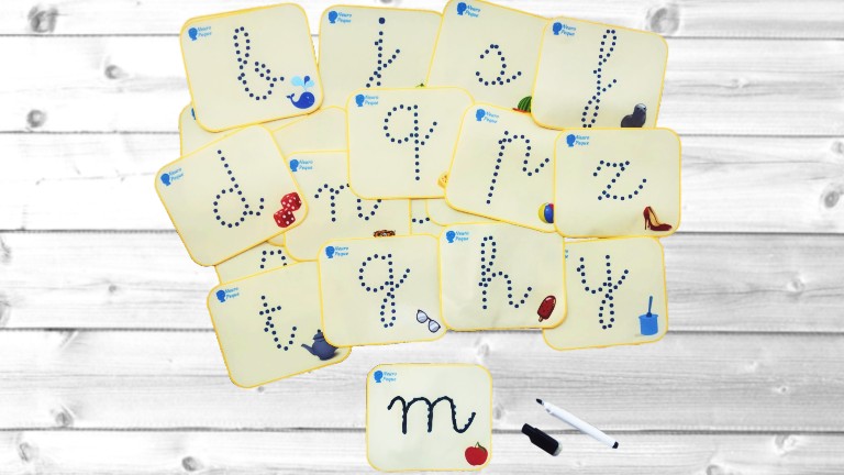 El material incluye 22 tarjetas con la grafía de las consonantes en minúsculas y un dibujo cuyo nombre inicia con su consonante correspondiente.
