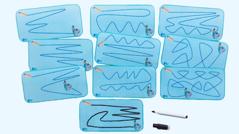 El material incluye 10 tarjetas pequeñas y 4 tarjetas grandes con diferentes líneas rectas y curvas para repasar.