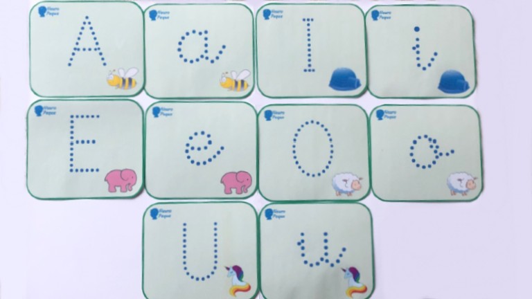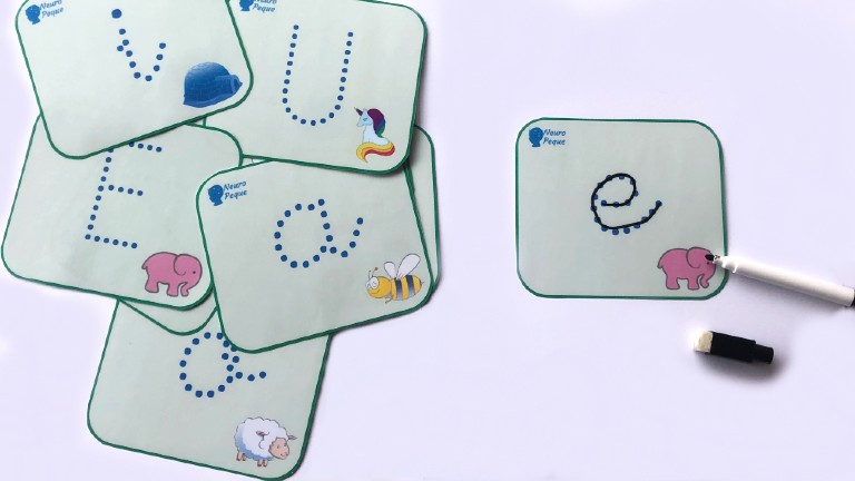 El material incluye 10 tarjetas con la grafía de las vocales, tanto en mayúsculas como en minúsculas, y un dibujo cuyo nombre inicia con su vocal correspondiente.