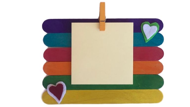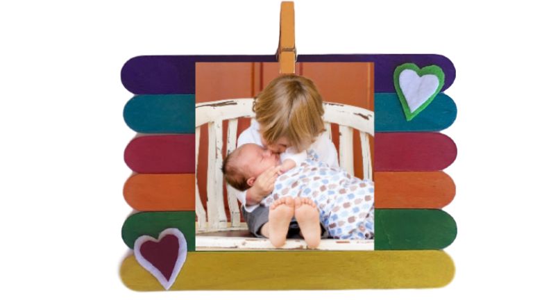 Hoy os propongo la primera manualidad de este blog! Un marco de fotos para niños con palitos de madera de colores.