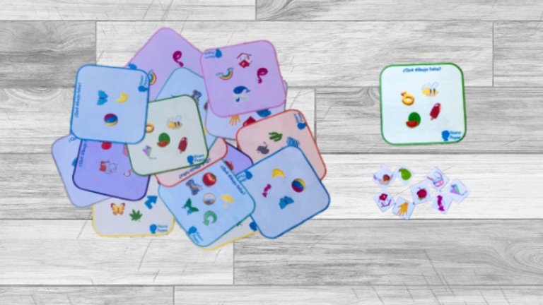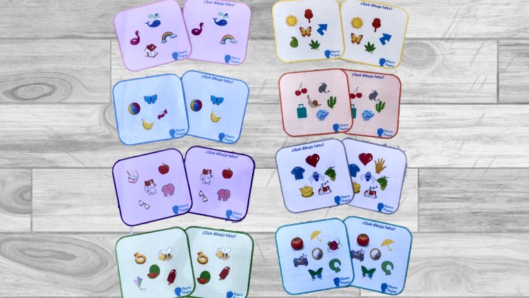 - Enseñamos a los peques la primera tarjeta y le dejamos un tiempo para memorizar los dibujos. Después le mostraremos la tarjeta en la que falta un dibujo y deberán buscar el dibujo que falta entre los dibujos sueltos recortados.