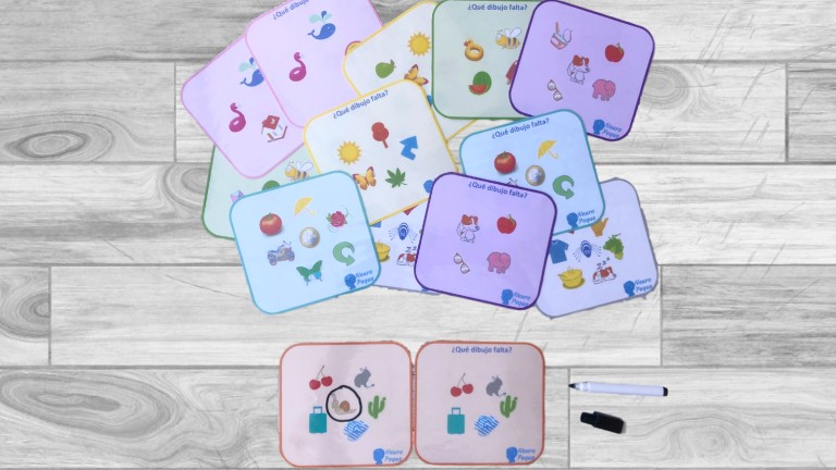 - Además podemos trabajar sin los dibujos sueltos recortados, poniendo en la mesa las dos tarjetas (la que contiene todos los dibujos y la tarjeta en la que falta un dibujo). Aquí los peques deberán rodear el dibujo que falta en la tarjeta en la que están todos. De esta forma también trabajamos la atención.
