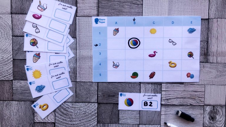 • La primera es que los peques busquen en la tabla el dibujo que aparece en la tarjeta, miren las coordenadas y las escriban en las tarjetas