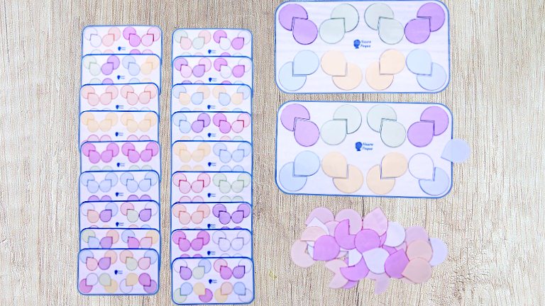 Este material, que podréis descargar al final del post, incluye 18 tarjetas modelo, 1 plantilla vacía (si queréis personalizar las plantillas, tendréis que imprimir dos copias) y las piezas de colores (será necesario para completar las plantillas que imprimáis mínimo 4 copias de la hoja donde están las piezas de colores). Las tarjetas son de diferentes niveles de dificultad, dependiendo de los colores y de su ubicación será más o menos difícil.